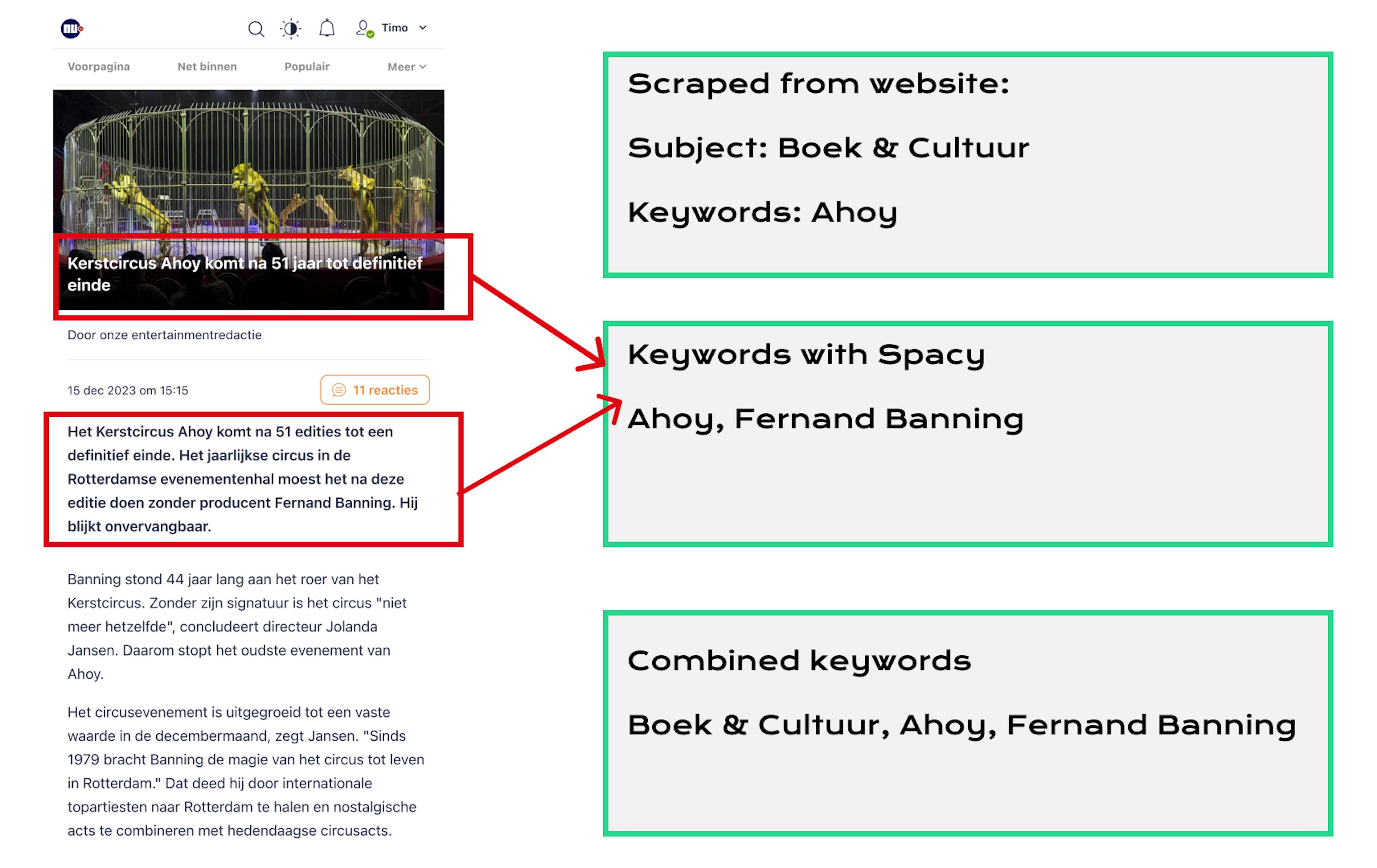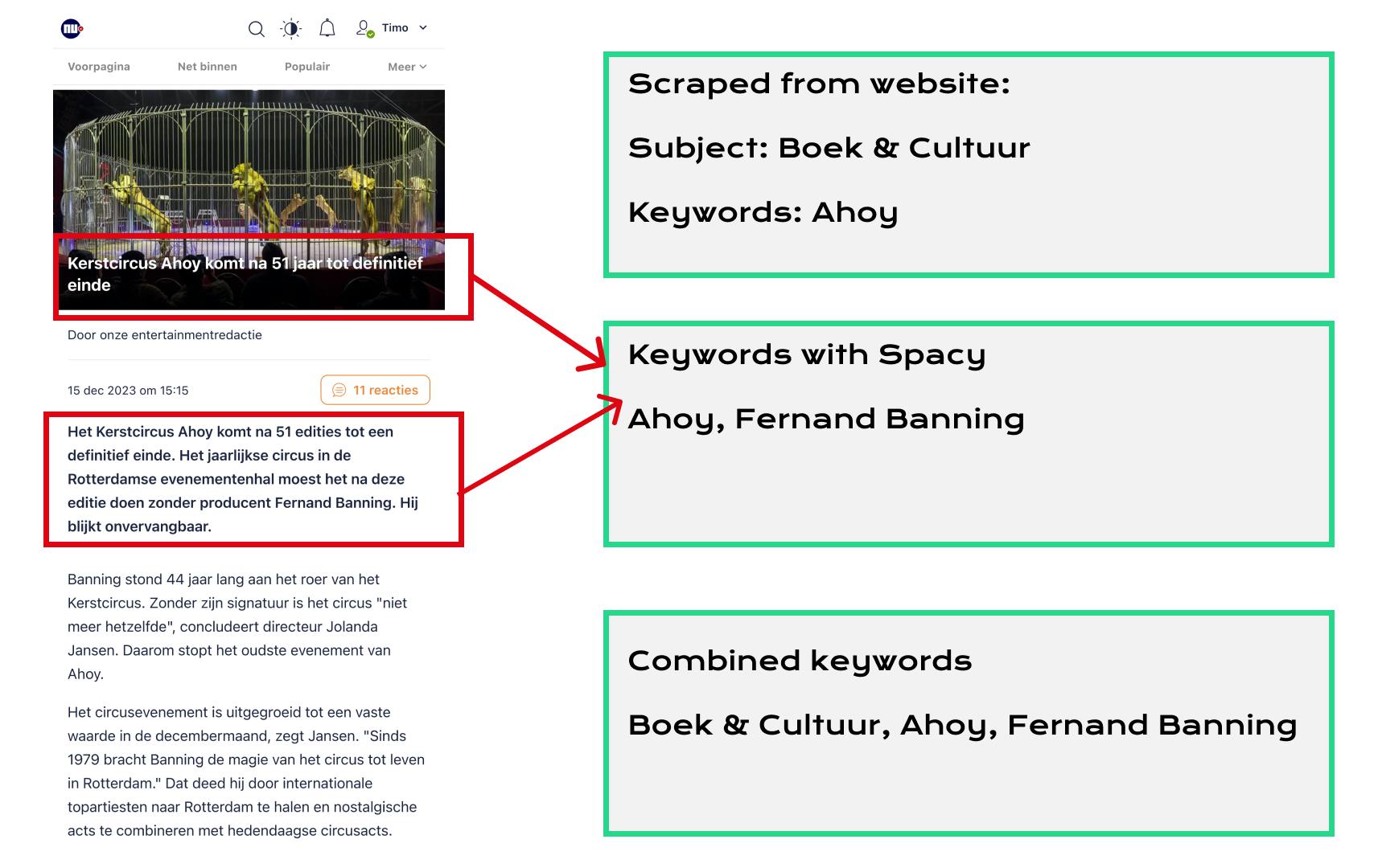 Met behulp van gescrapete data van NU.nl identificeert de extract_keywords functie entiteiten zoals personen, organisaties, locaties, landen en dieren uit de tekst. Het doel is om een gestructureerde aanpak te creëren waarbij het eerste trefwoord het onderwerp is, gevolgd door het samenvoegen van gespecificeerde trefwoorden van NU.nl met de geëxtraheerde, om consistentie te waarborgen.