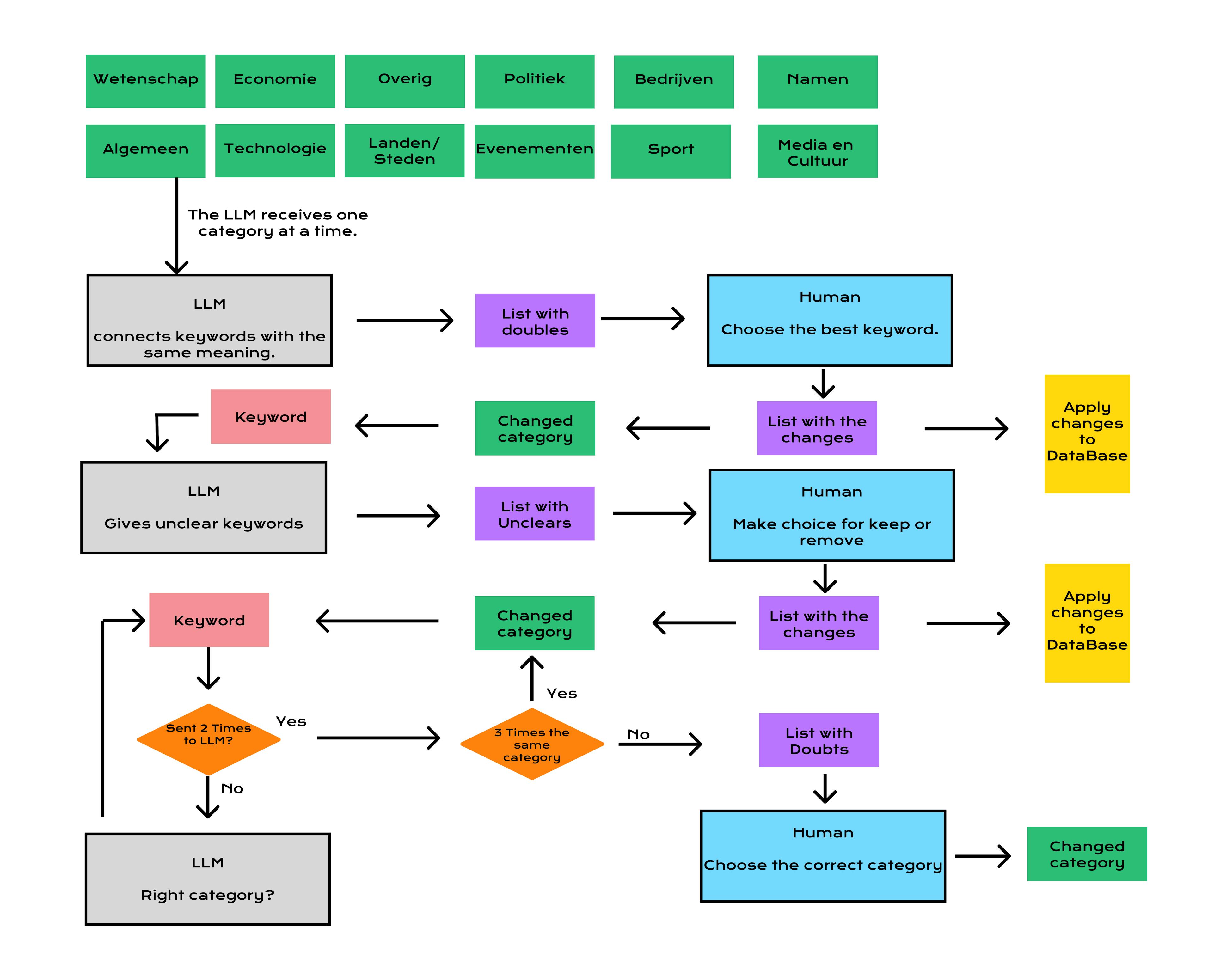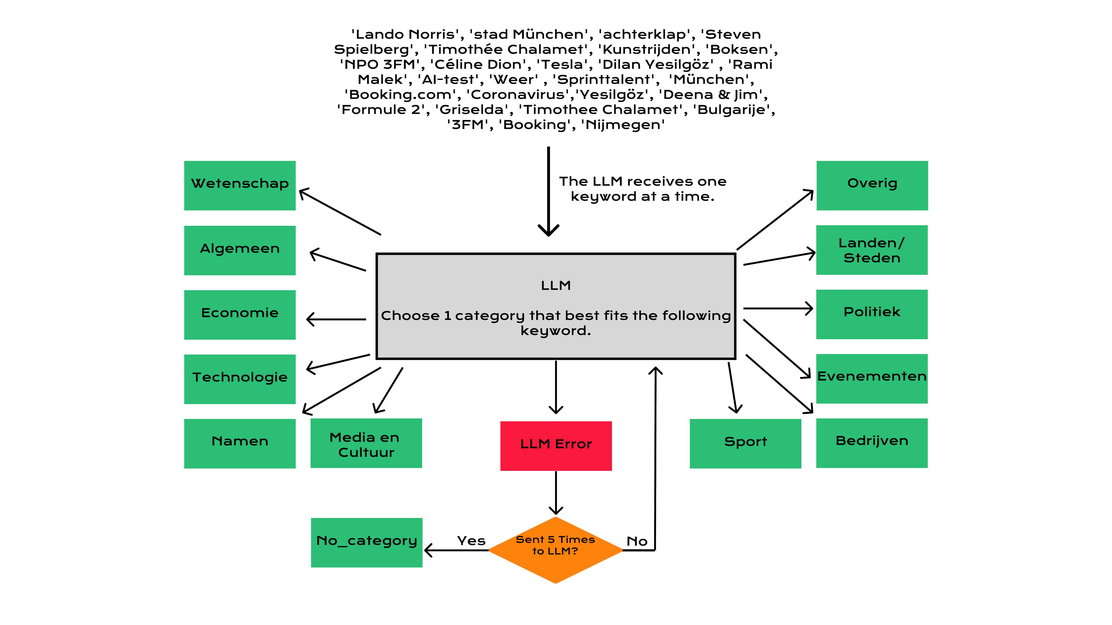 Alle trefwoorden worden naar de LLM gestuurd voor categorisering. Als de LLM na vijf pogingen geen correcte categorie retourneert, wordt het trefwoord opgeslagen in de "no_category" categorie. De gebruiker beoordeelt alle niet-gecategoriseerde trefwoorden en wijst ze toe aan de bestaande categorieën.